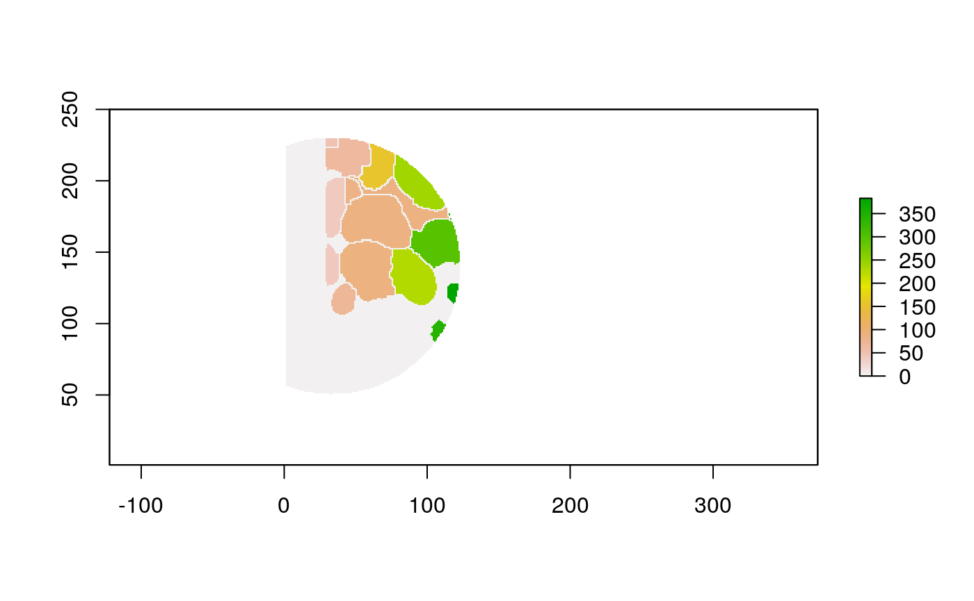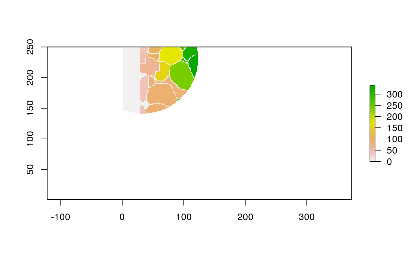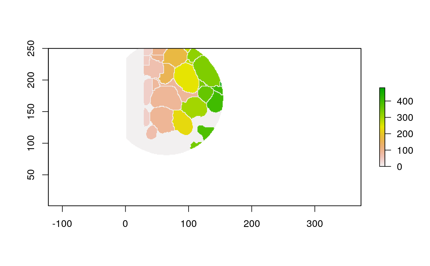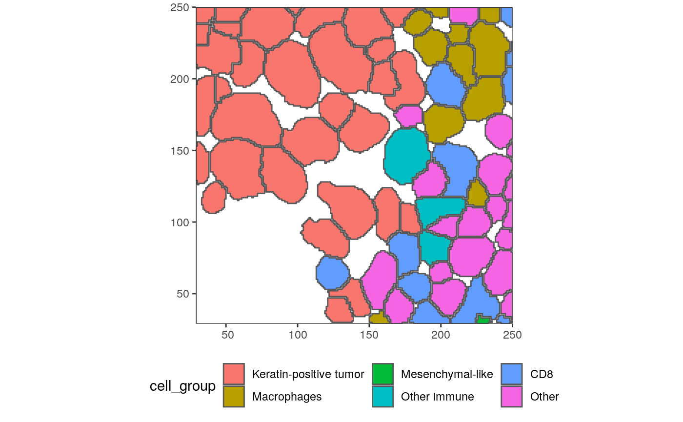polys <- polygonize(im) %>% inner_join(cell_data) %>% group_by(cellLabelInImage) %>% # some regions get split into two adjacent polys --> merge inner_join(cell_data) %>% group_by(cellLabelInImage) %>% summarise_all(function(x) { x[1] })