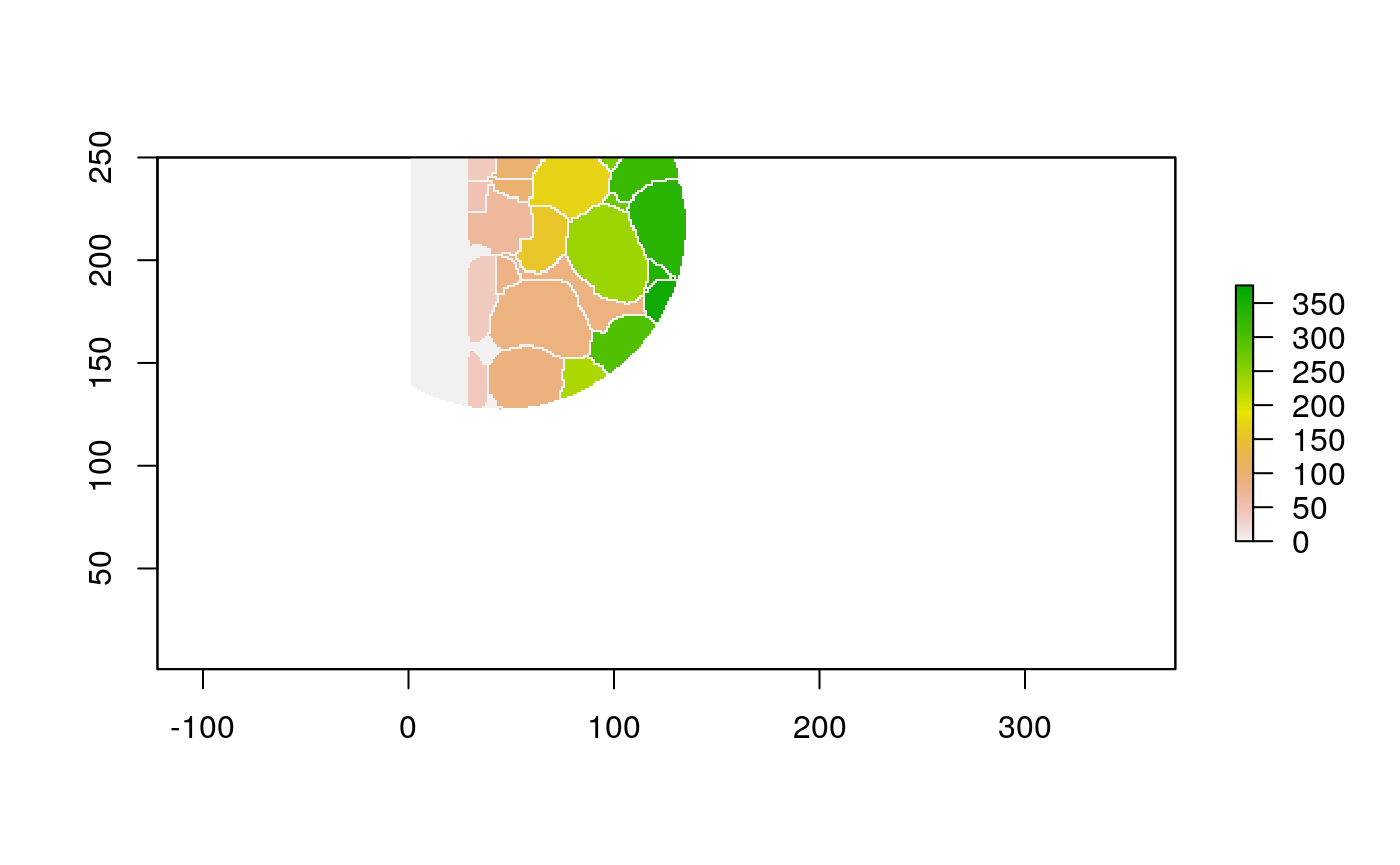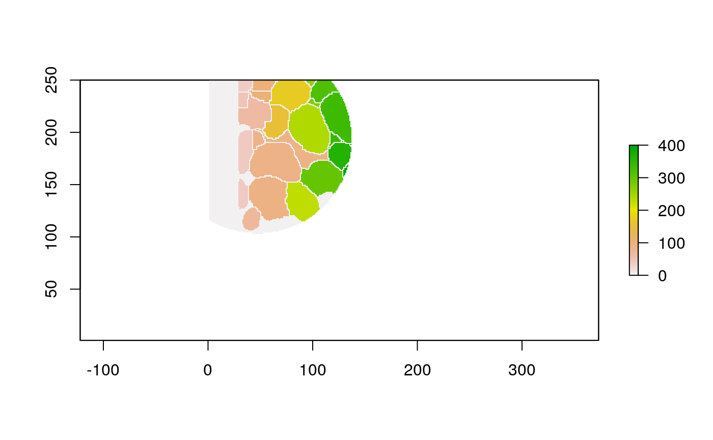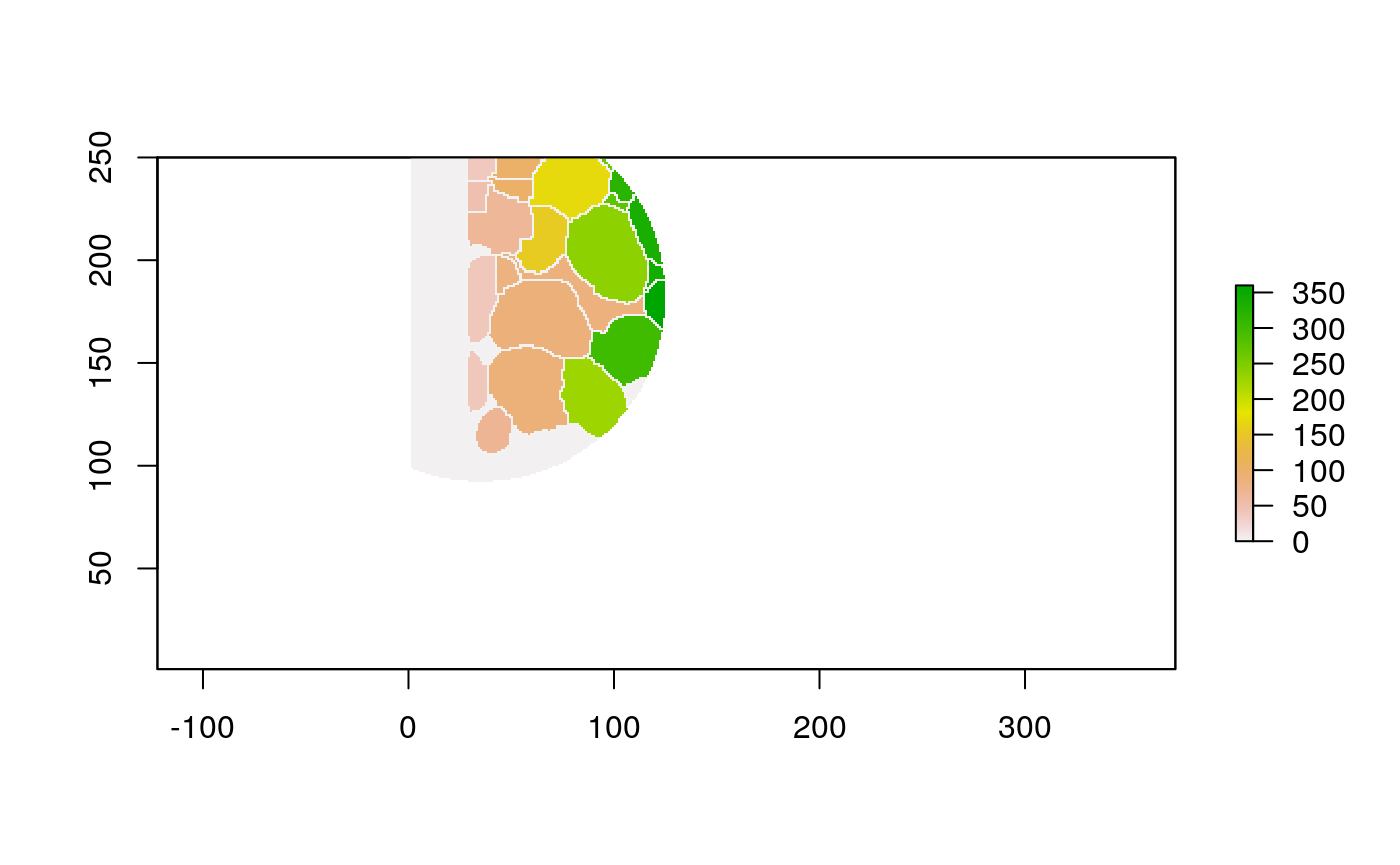 polys <- polygonize(im) %>% inner_join(cell_data) %>% group_by(cellLabelInImage) %>% # some regions get split into two adjacent polys --> merge inner_join(cell_data) %>% group_by(cellLabelInImage) %>% summarise_all(function(x) { x[1] })