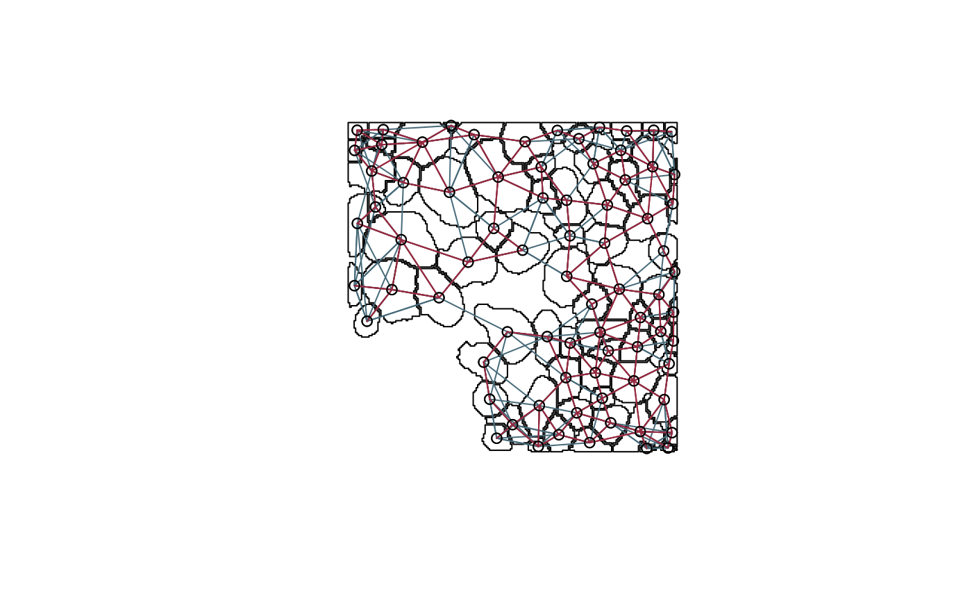 nb_contig <- poly2nb(polys, snap=1) # contiguity graph coords <- polys %>% .[["geometry"]] %>% st_centroid() %>% st_coordinates() nb_knn <- knn2nb(knearneigh(coords, k = 5)) # knn graph plot(polys$geometry[seq_len(nrow(polys))]) plot(nb_knn, coords, add=T, col="#476a79") plot(nb_contig, coords, add=T, col="#97293f")
